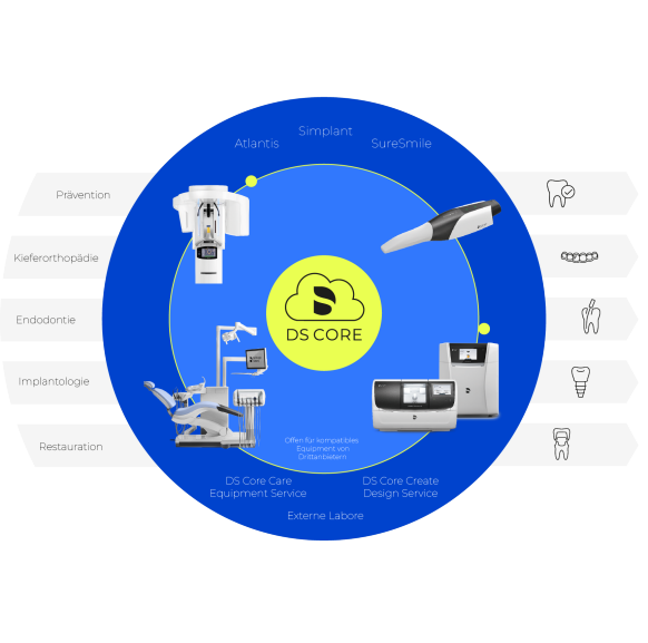 DS Core ist das Rückgrat der Connected Dentistry von Dentsply Sirona, das verschiedene Lösungen in Ihrer Praxis, von Bildgebungsgeräten bis hin zu CAD/CAM-Systemen, in ein übergreifendes Ökosystem integriert. DS Core zentralisiert Patientendaten und ermöglicht die Diagnose, Patientenberatung sowie Echtzeit-Zusammenarbeit zwischen Ihrem Team und Ihren Partnern durch cloudbasierte Workflows. Es ist die Plattform, die alles miteinander verbindet, um Zahnärzte beim Wachstum ihrer Praxis, bei der Optimierung ihrer Arbeitsabläufe und der Verbesserung der Behandlungsergebnisse ihrer Patienten unterstützt.