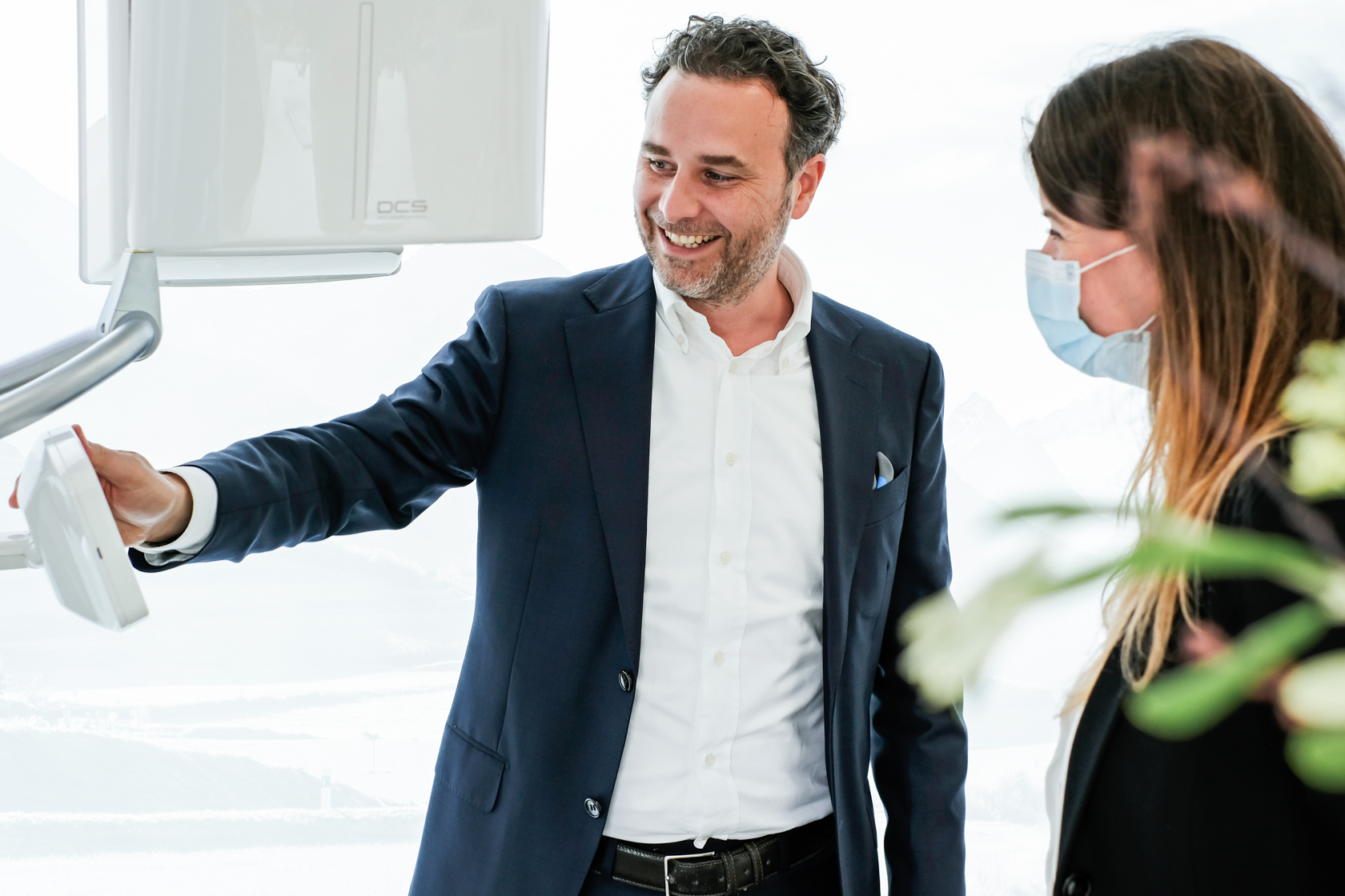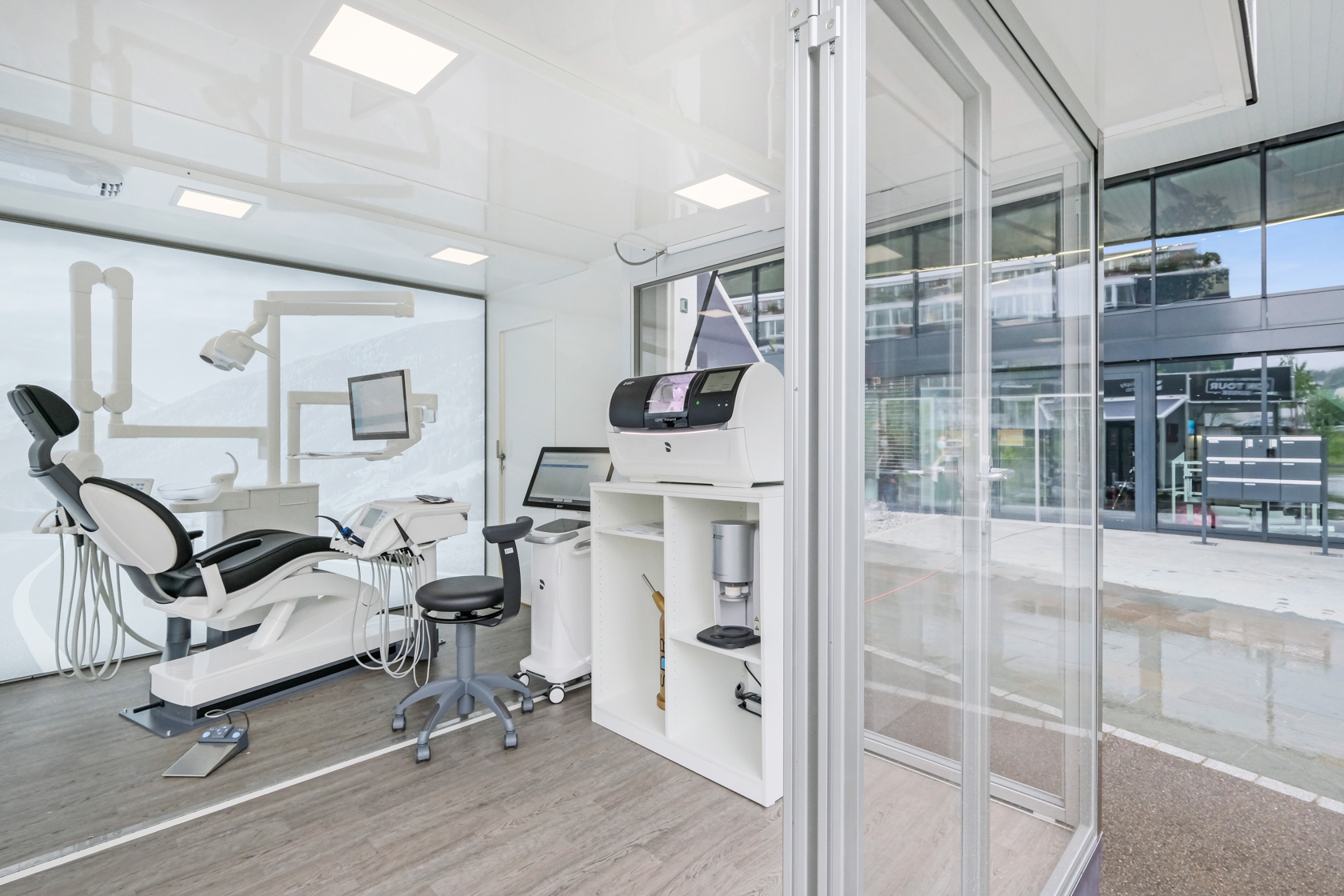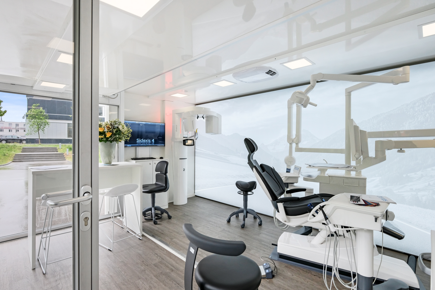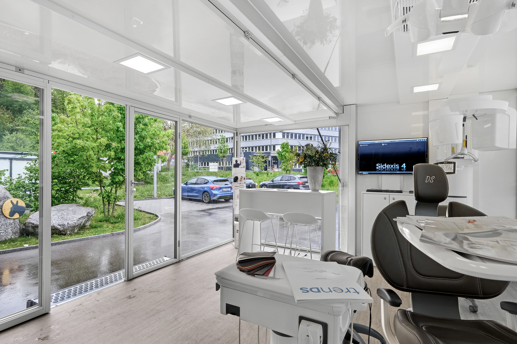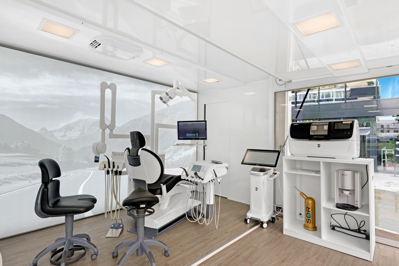 Gleich wie in unserem Showroom in Baden-Dättwil ist dabei die Ausstattung mit dem kompletten Equipmentportfolio. Für Sie an Bord haben wir unser neuestes 3D-Röntgengerät Axeos, eine Teneo Behandlungseinheit, die Primescan und die Primemill.
